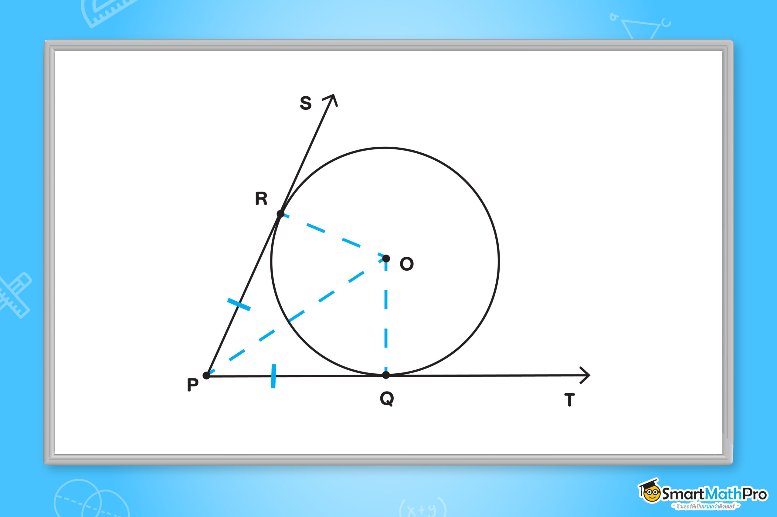 - P\widehat{R}O = P\widehat{Q}O = 90^{\circ} (จากทฤษฎีบทที่ 7 ที่ได้อธิบายไป)