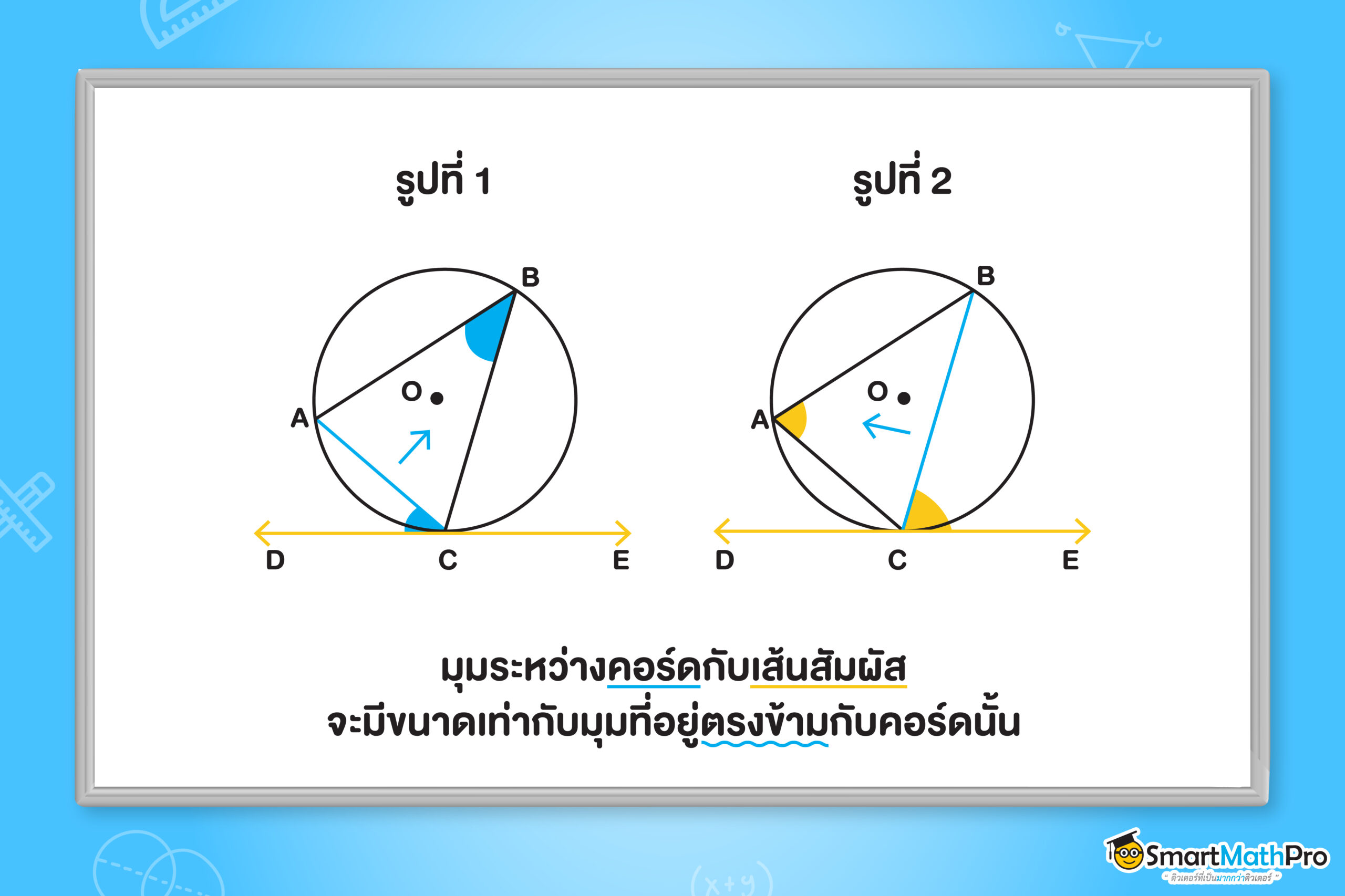 มุมที่เกิดจากคอร์ดและเส้นสัมผัสวงกลมที่จุดสัมผัส จะมีขนาดเท่ากับขนาดของมุมในส่วนโค้งของวงกลมที่อยู่ตรงข้ามกับคอร์ดนั้น