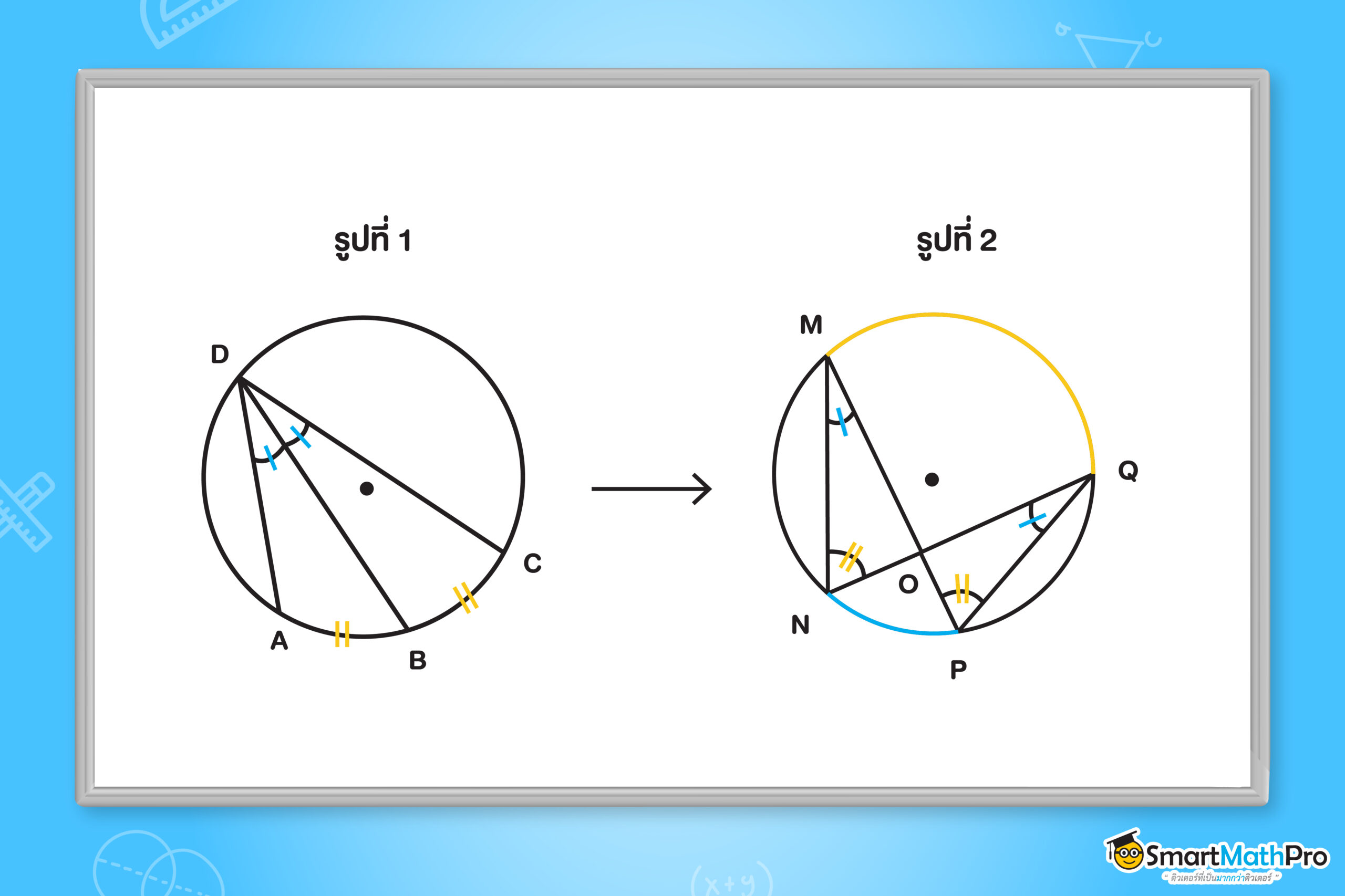 แล้วทั้งสองมุมจะมีขนาดเท่ากัน (ขากลับ) หรือ มุมที่รองรับด้วยส่วนโค้ง MQ คือ M\widehat{N}Q และ M\widehat{P}Q แล้วทั้งสองมุม