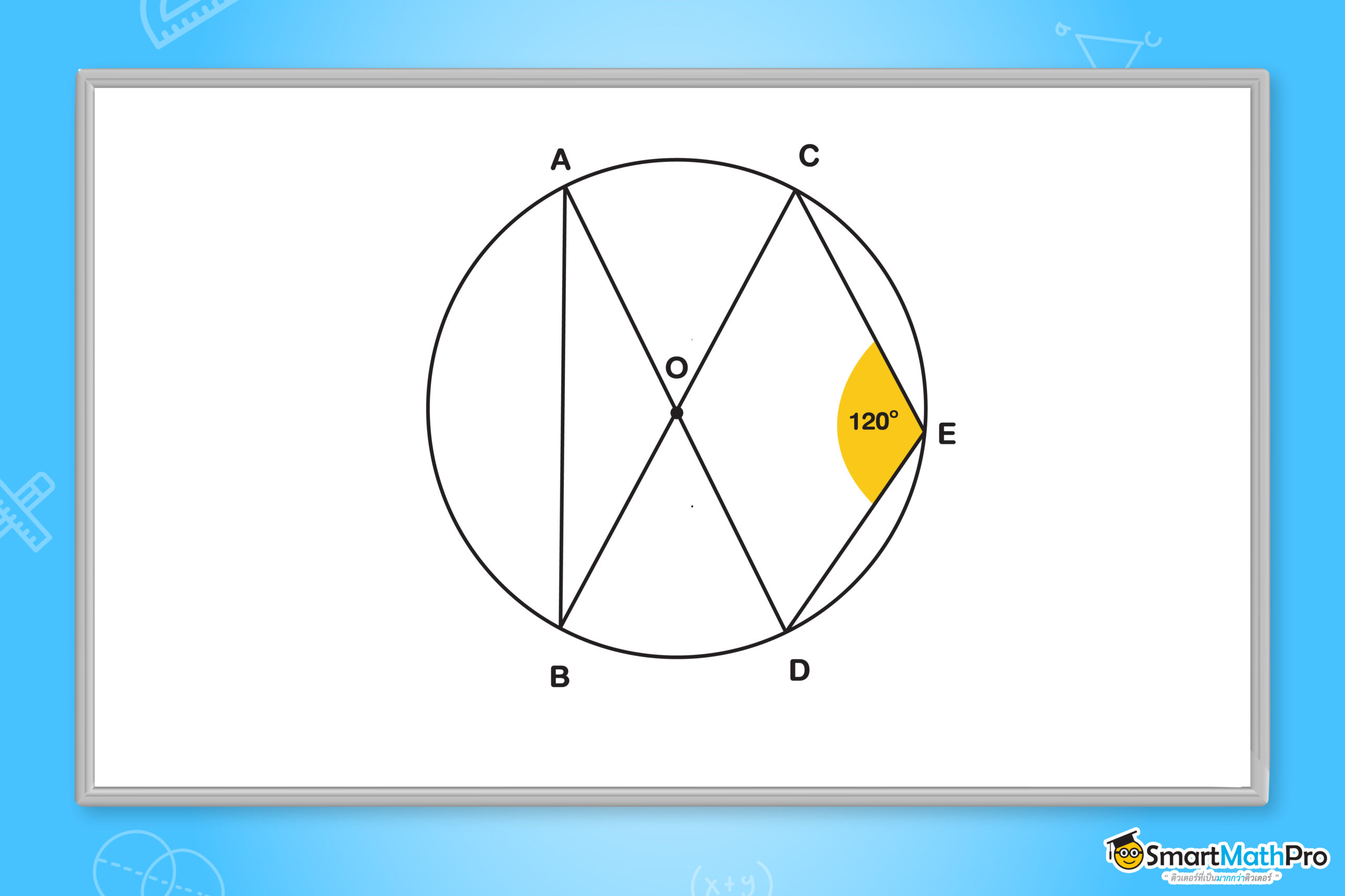 จาก ทฤษฎีบทที่ 1 ในวงกลมเดียวกัน มุมที่จุดศูนย์กลางจะมีขนาดเป็นสองเท่าของขนาดของมุมในส่วนโค้งของวงกลมที่รองรับด้วยส่วนโค้งเดียวกันและ C\widehat{E}D= 120^{\circ}