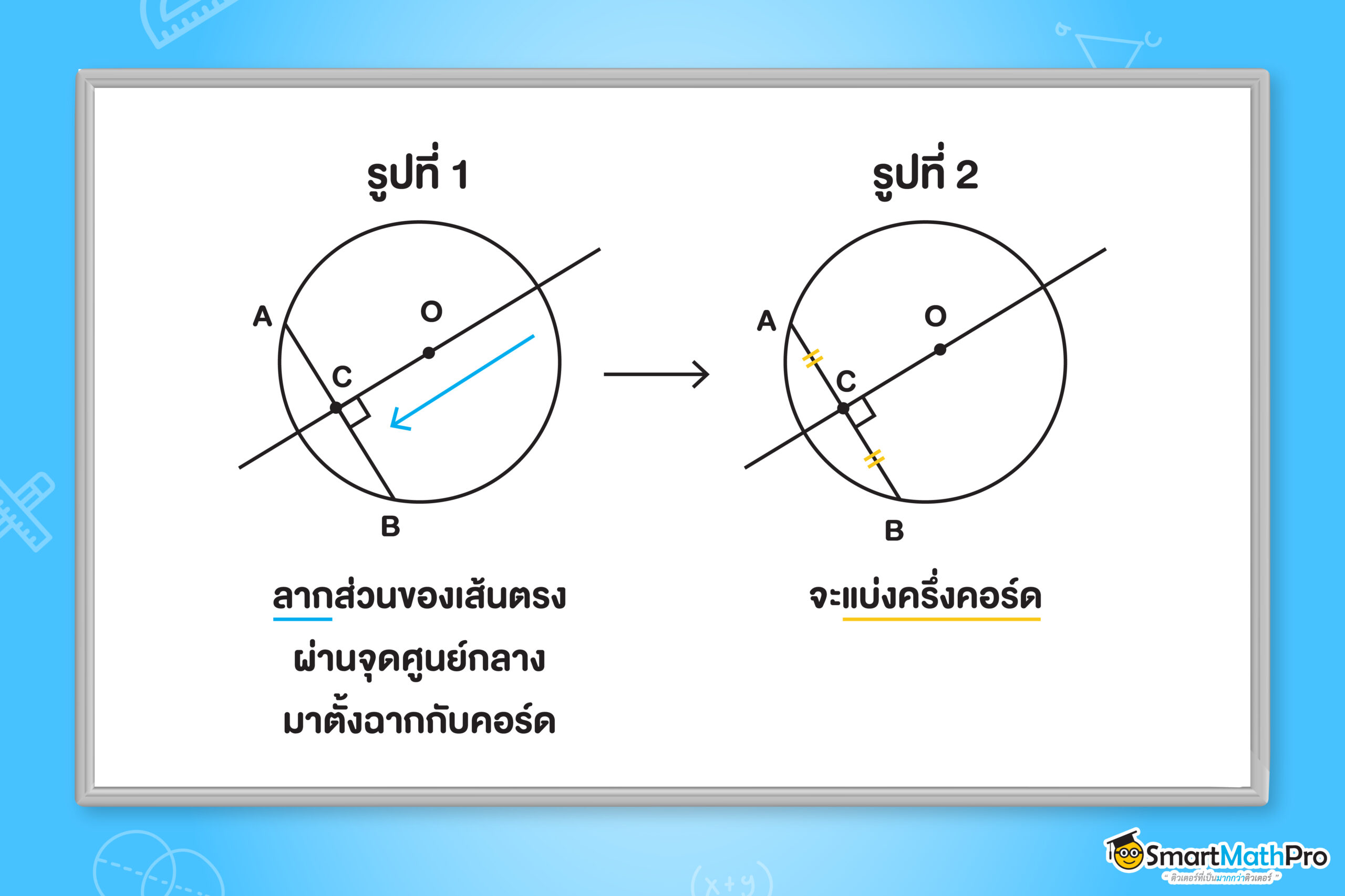 จากรูป น้อง ๆ อาจเริ่มสังเกตจากความยาวของคอร์ดทั้งสองเส้นในวงกลมมีความยาวเท่ากัน เลยทำให้ระยะห่างระหว่างจุด O (จุดศูนย์กลาง) กับคอร์ดเส้นทางซ้าย และ ระยะห่างระหว่างจุด O (จุดศูนย์กลาง) กับคอร์ดเส้นทางขวาห่างเท่ากัน