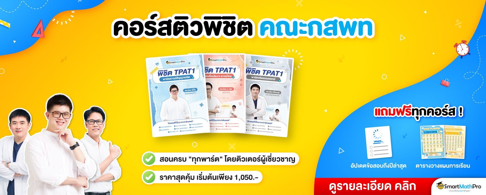 พี่ขอแนะนำตัวช่วยอย่าง คอร์สเตรียมสอบมหาลัยฯ ของ SmartMathPro เลยย มีให้เลือกมากมายทั้งสนาม TGAT / TPAT หรือ A-Level และสอนโดยติวเตอร์ที่มีความเชี่ยวชาญในแต่ละวิชาด้วย