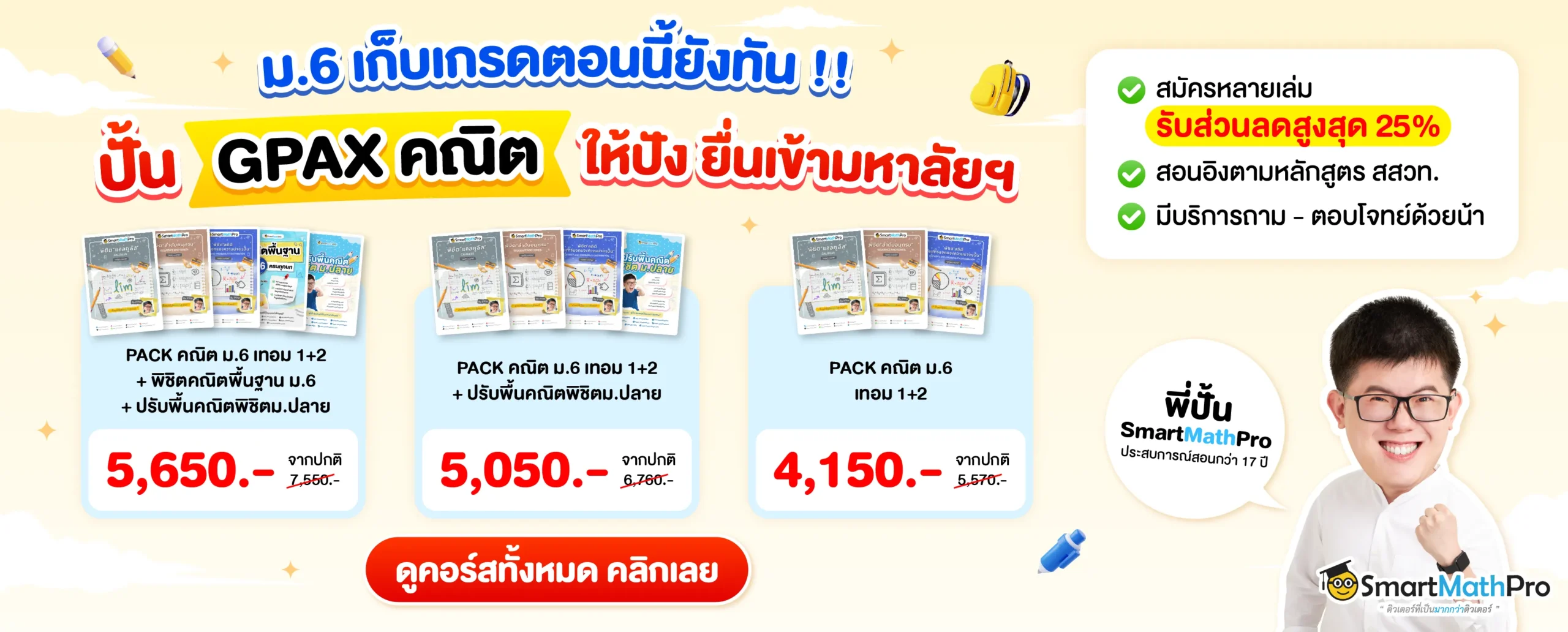 พี่ขอแนะนำคอร์สติวคณิตศาสตร์ ม.4 – 6 แบบบุฟเฟต์สำหรับเสริมเกรด จาก SmartMathPro เลยย สมัครครั้งเดียวคุ้มมากกเรียนได้จนจบม.6 พร้อมส่วนลดสูงสุด 35%