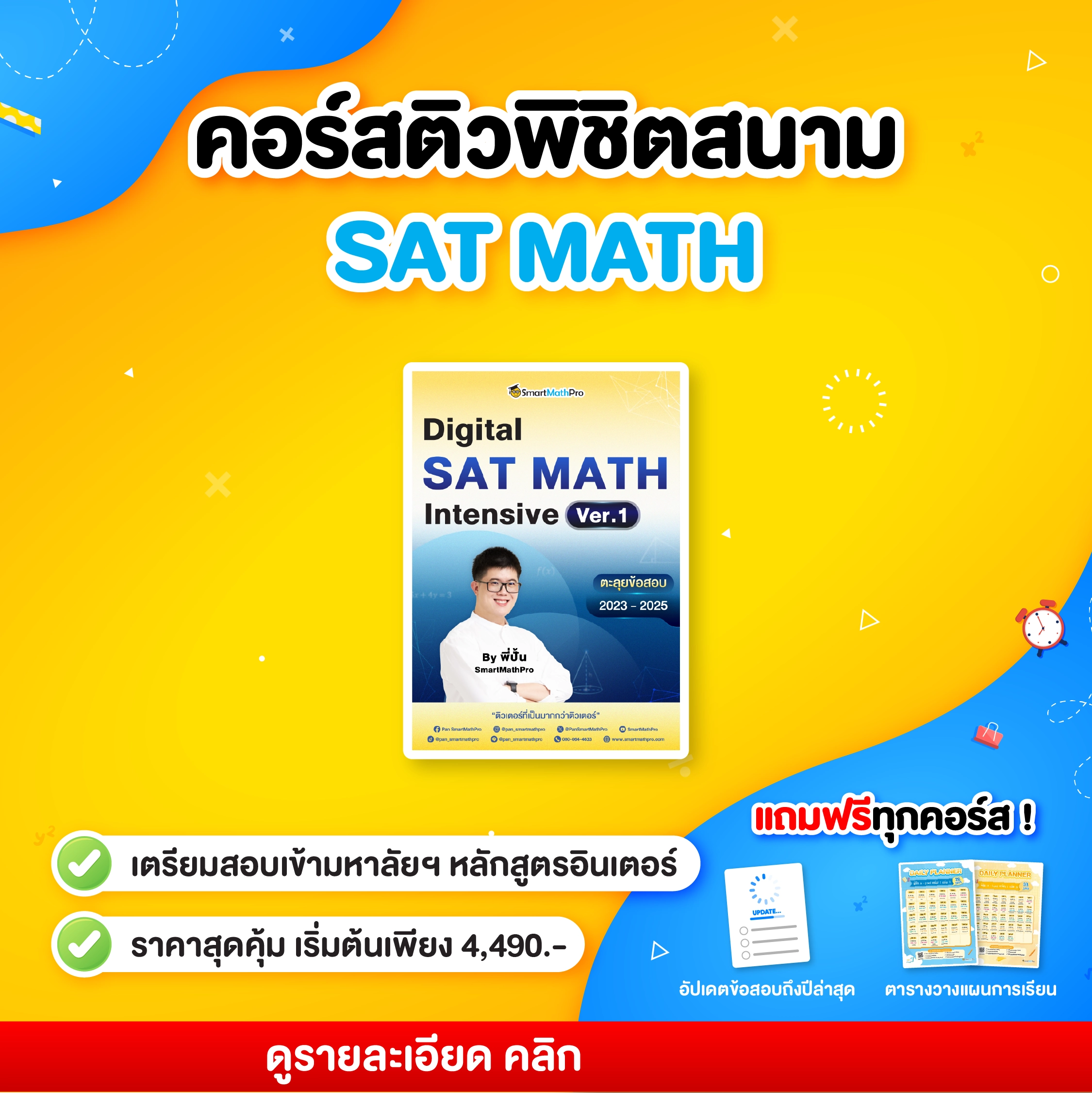 พี่ขอแนะนำ คอร์ส SAT MATH (Digital SAT MATH Intensive Ver. 01) สอนโดยพี่ปั้น SmartMathPro ซึ่งคอร์สนี้จะพาตะลุยโจทย์ Digital SAT MATH ครบทุกหัวข้อ โดยเป็นโจทย์จากแนวข้อสอบจริงปี 2023 ถึง 2025 โดยพี่ปั้นจะพาทำโจทย์อย่างละเอียดและครอบคลุม พร้อมสอนเทคนิคเจ๋ง ๆ ในการทำโจทย์แต่ละข้อแบบจัดเต็ม ใครสนใจสามารถ คลิก ไปดูรายละเอียดได้เลยย