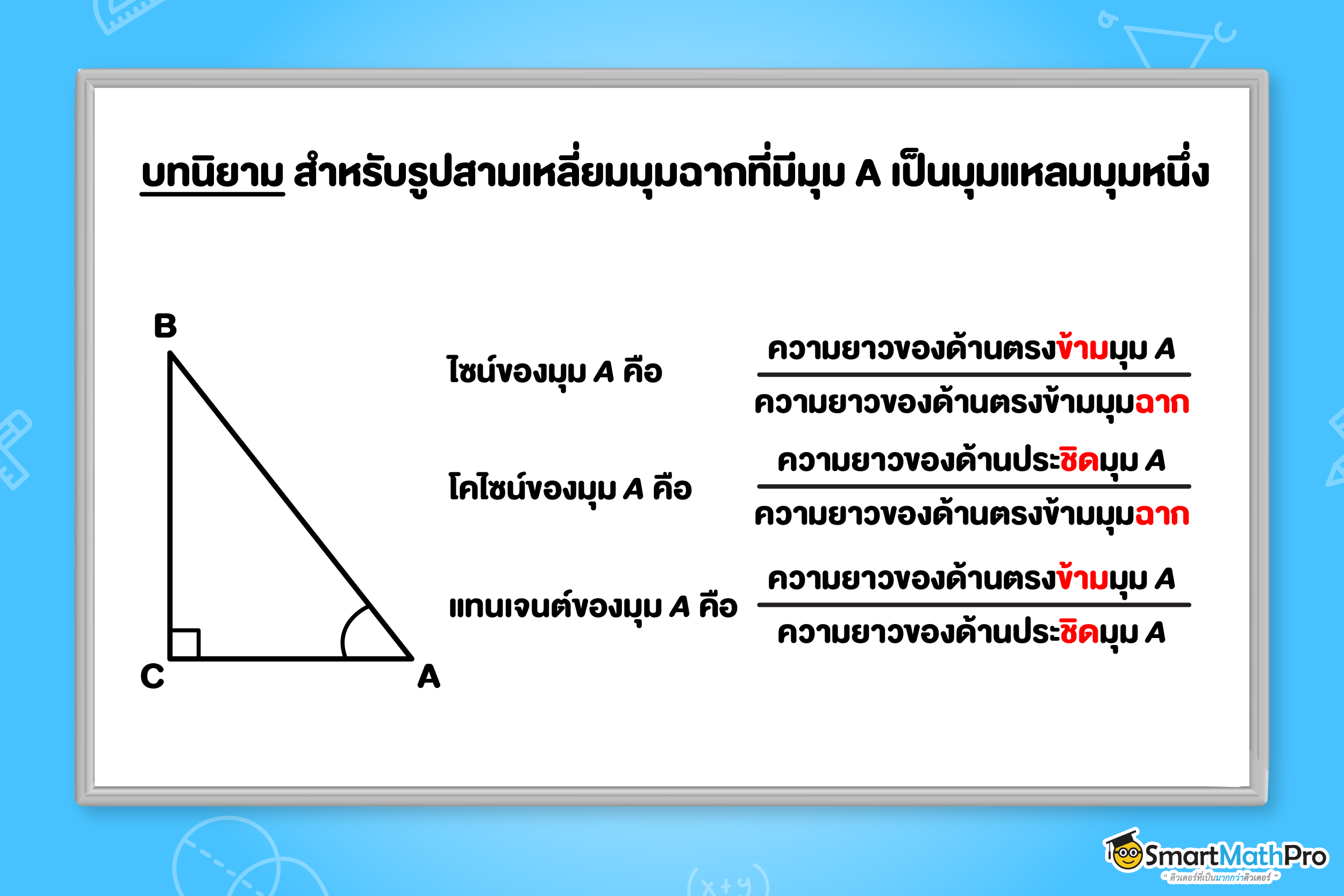 รูปสามเหลี่ยมมุมฉาก ABC ซึ่งมี C เป็นมุมฉาก เมื่อเราพิจารณามุมมุมหนึ่งที่ไม่ใช่มุมฉาก เช่น มุม A แล้วจะได้ว่า