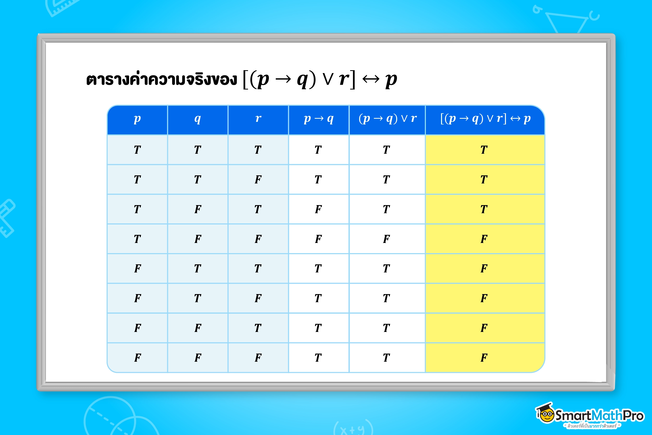 ดังนั้น ประพจน์ (p\vee\sim q)\leftrightarrow r มีค่าความจริงเป็น จริง
