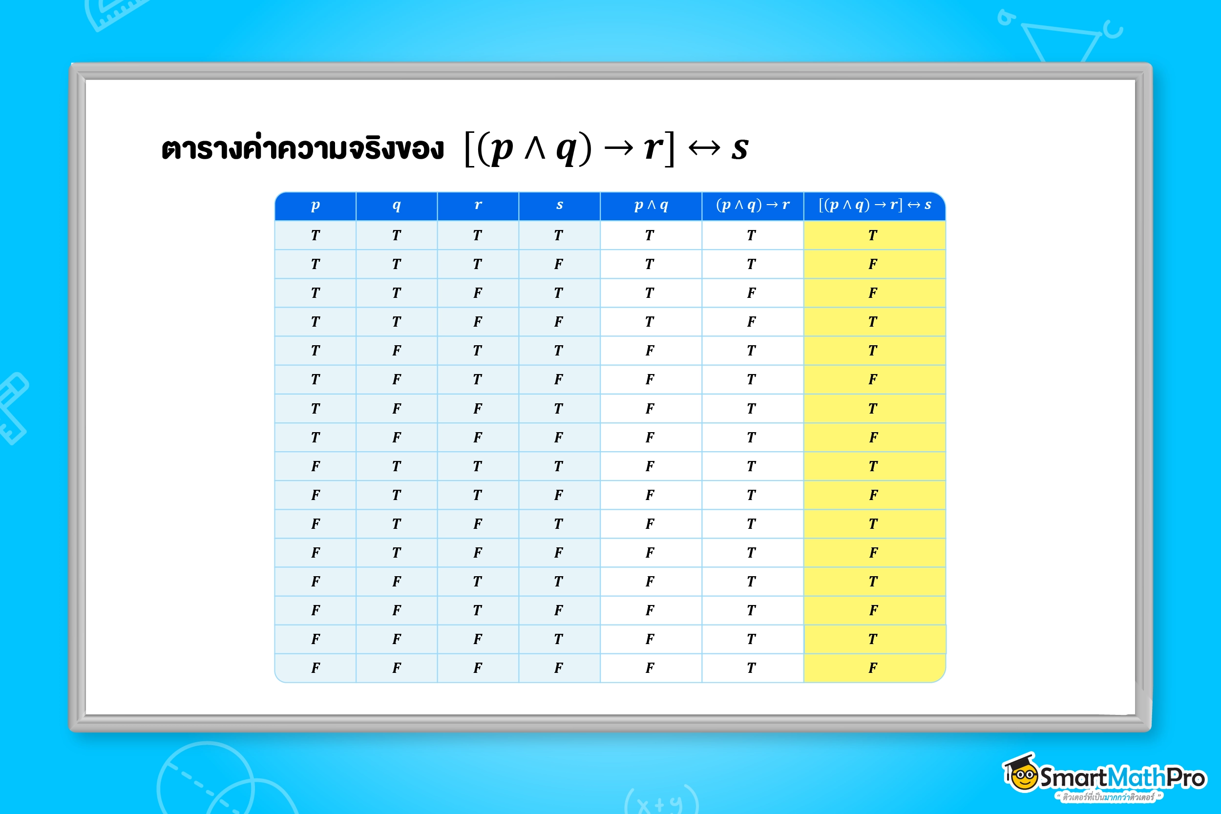 จากโจทย์มี 4 ประพจน์ย่อย คือ p, q,r และ s ดังนั้นจะมีกรณีเกี่ยวกับค่าความจริงทั้งหมด 2^{n}=2^{4}=16 กรณี